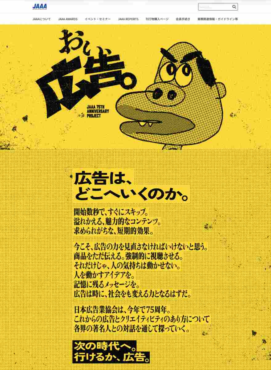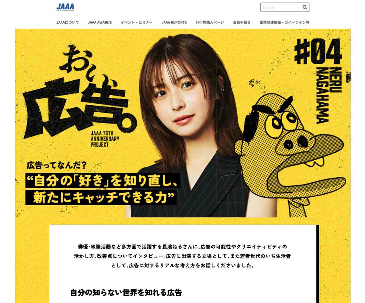 日本広告業協会(JAAA)は、創立75周年記念事業として、特別コンテンツ「『おい、広告。』叱咤激励インタビュー」を1月23日に公開した。テレビプロデューサー・ラジオパーソナリティの佐久間信行、アーティストのきゃりーぱみゅぱみゅ、若手経営者ゆとりくん(片石貴展)、女優の長濱ねる、お笑いトリオ秋山寛貴(ハナコ)など各業界で活躍する著名人へのインタビューを通じて広告の現在地を確認し、未来への向き合い方や社会的意義を拡張することを意図する。JAAAに加盟する広告会社の若手社員がインタビュアーを務め、その内容を特設ページで発信する。