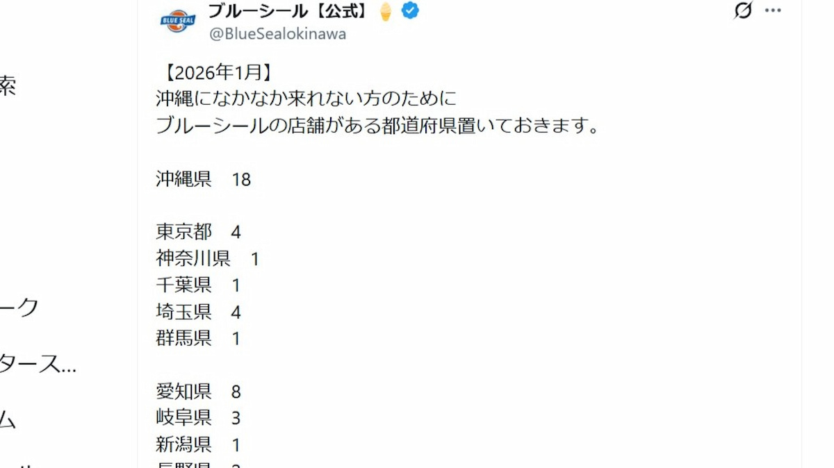沖縄のアイスクリームブランド「ブルーシール」が、日本全国で改めて注目を集める機会となった。1月12日、「X」(旧Twitter)の公式アカウントが「沖縄になかなか来れない方のために、ブルーシールの店舗がある都道府県置いておきます。」と投稿。各県の店舗数を一覧で示したところ、約1週間で163万件表示され、140件以上のコメントが寄せられた。「自分の県にも進出してほしい」といった声が多く、特に沖縄に店舗がない九州のユーザーからの要望も目立った。投稿の狙いと、注目を集めている「県外展開」について広報に尋ねた。