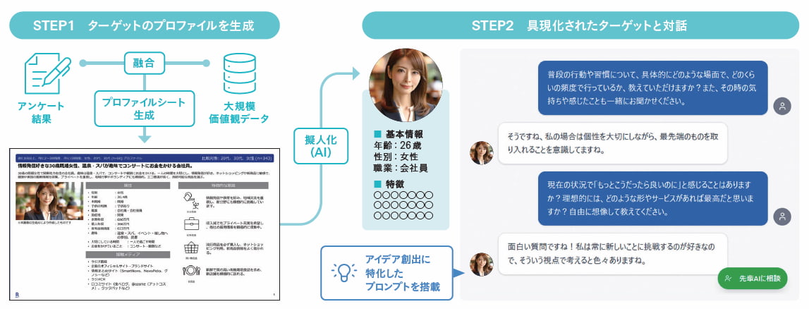 「アンケート結果」と「大規模価値観データ」をAIが融合し、ターゲットを「擬人化AI」として具現化。このAIとの対話から、顧客の深層ニーズをダイレクトに引き出し、これまでにない革新的なアイデアを創出する。