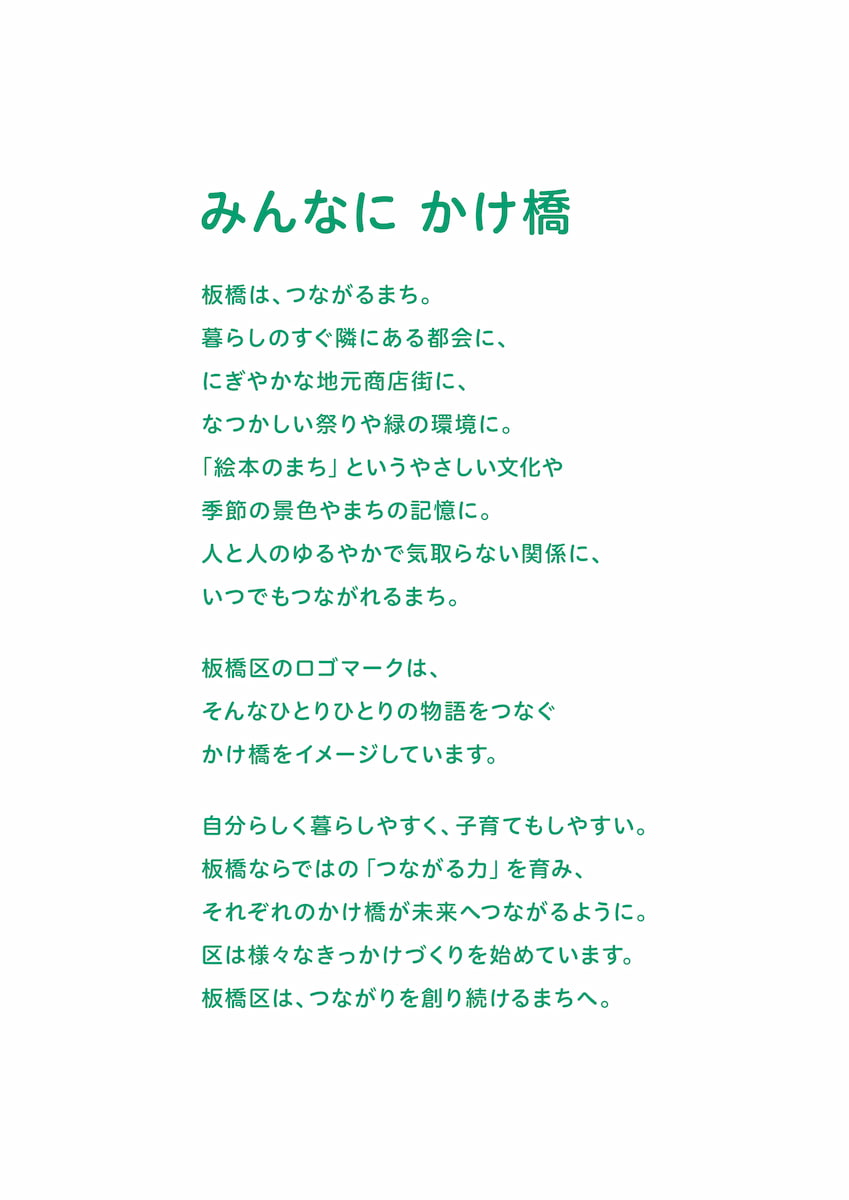 令和7年度第3回区長記者会見において、坂本健板橋区長より発表された新しいブランドスローガンは「みんなに かけ橋」である。そしてオフィシャルロゴは、一人ひとりの物語をつなぐかけ橋をイメージしたデザインになっている。
