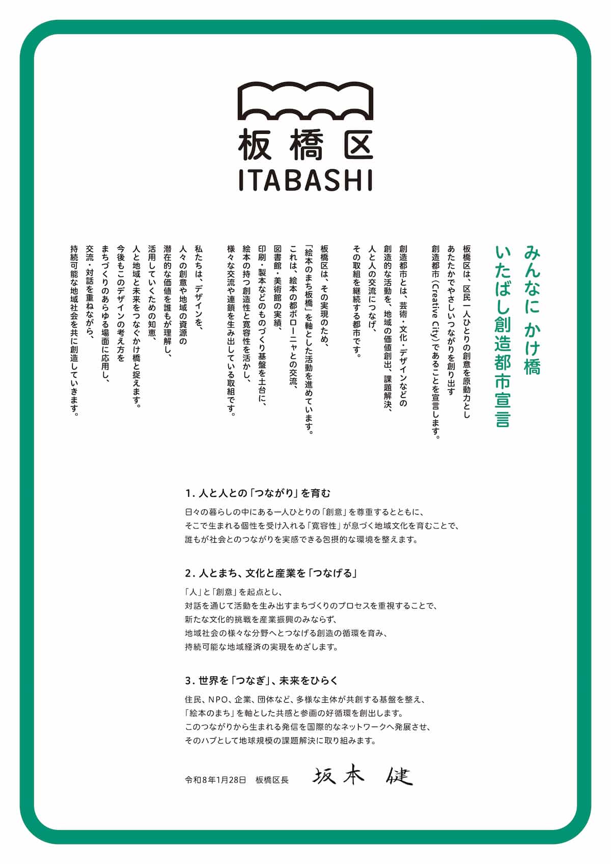 板橋区が「創造都市(Creative City)」としてさらなる発展を遂げるため、「絵本のまち板橋」を始めとする区の創造的な取り組みを土台に、区民と共に新しい未来を創っていくことを広く社会に知ってもらうことを目的としている。