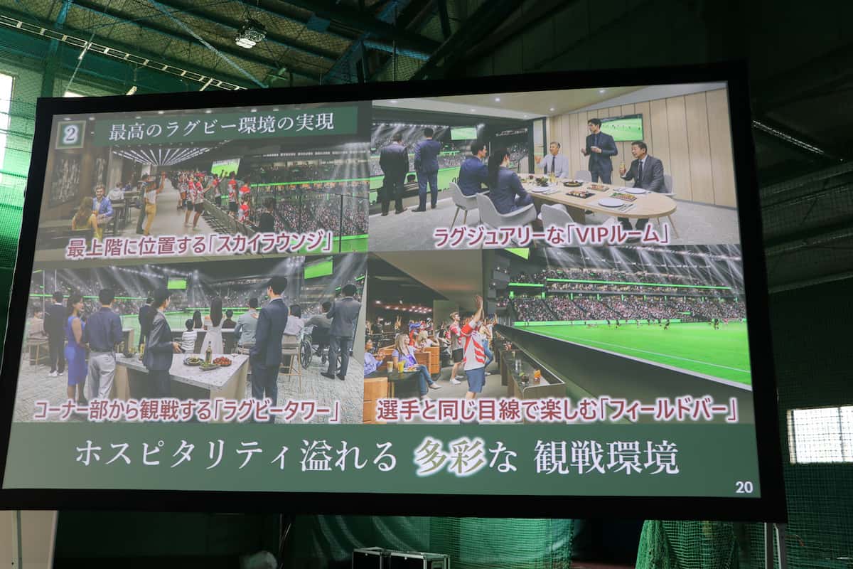第三は「感動のエンターテインメント空間」の創出である。ラグビーの試合に加え、約2.5万人規模のコンサートや各種イベントに対応可能な設計となっている。50メートル×12メートルの大型ビジョンを設置し、都心という立地を活かして国内外のトップアーティストの公演を誘致し、エンターテインメントの中心地となることを目指す。