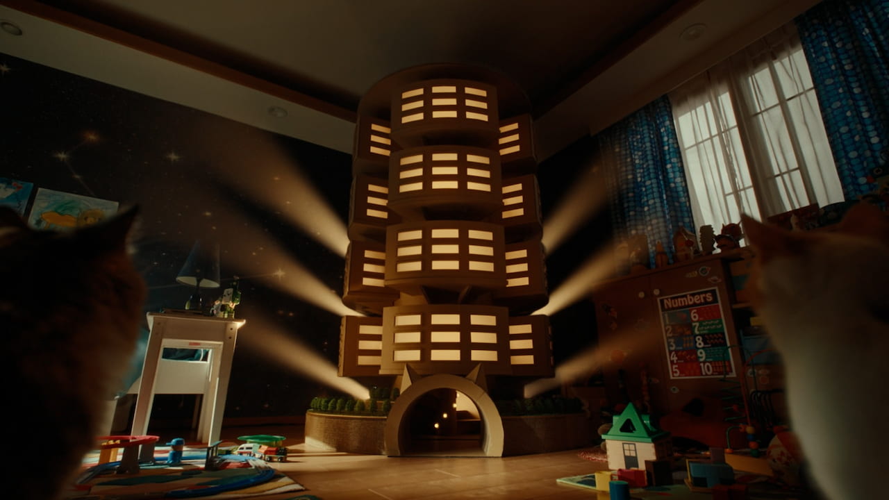 撮影時には実際に猫に使用してもらった。渡邊氏は「人に囲まれた慣れない環境だったはずだが、カメラが回ってないところで爪とぎを楽しんでいたり、あくびをしながらくつろいでいたりと、ダンボールタワマンの生活を満喫してくれていた」としている。