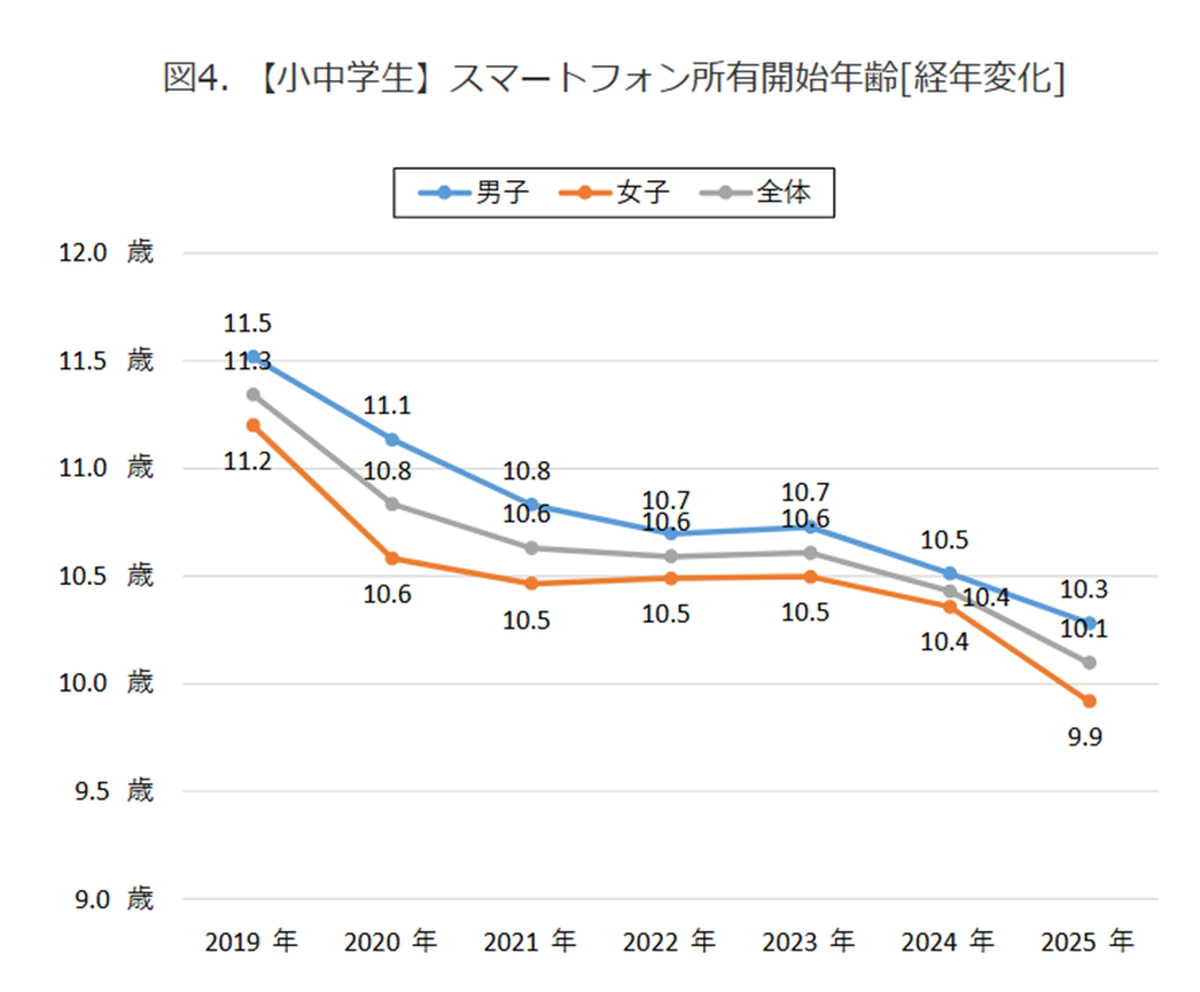 スマートフォンを持ち始めた時期についての調査で最も回答数が多かったのは、男女共に12歳。一方でスマートフォンの所有開始年齢の平均値は年々低下しており、2025年は平均10.2歳であった。性別別にみると男子が平均10.4歳、女子が平均9.9歳。2018年の調査開始以来、初めて10歳を下回る結果となった。