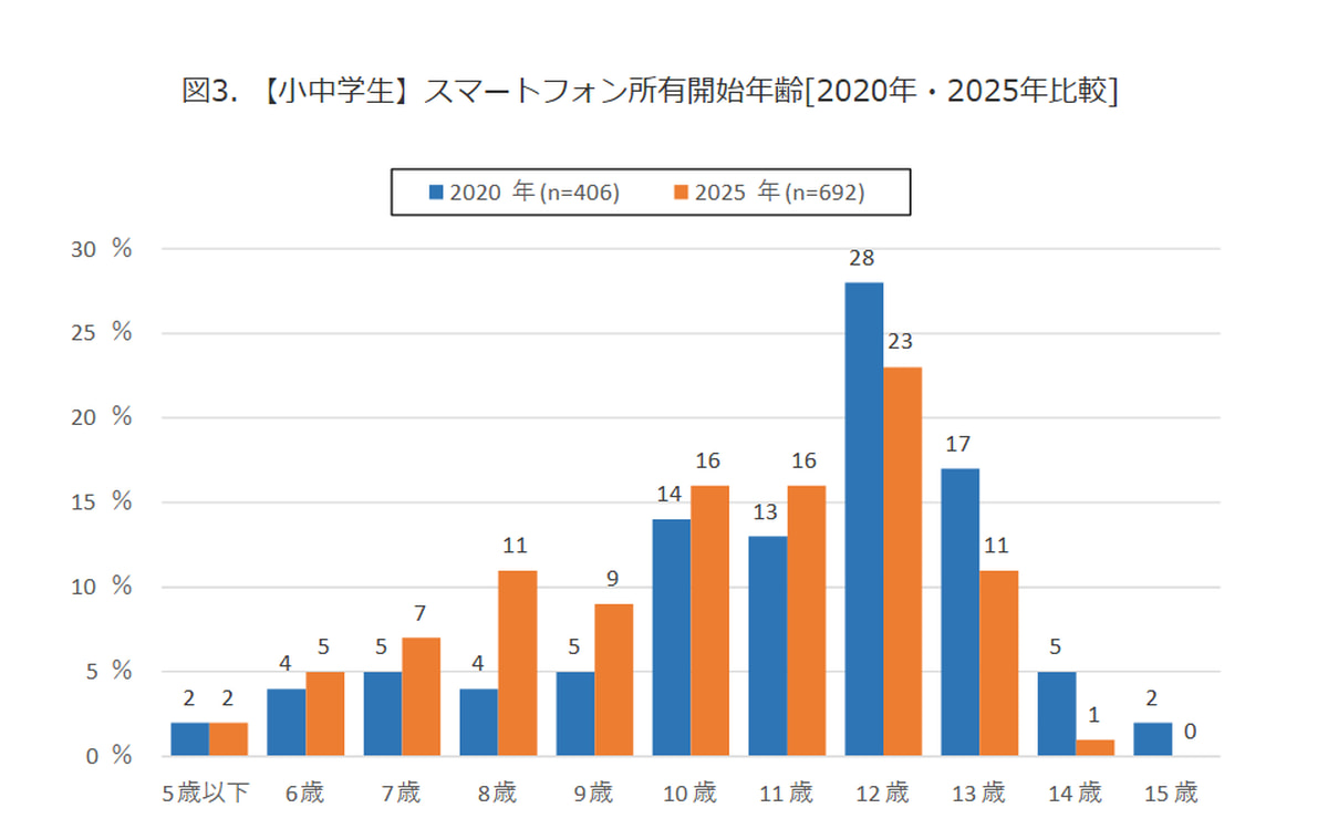 2020年の結果と比較すると、スマートフォンを持ち始めた年齢層が12歳である点は変わっていないが、2020年が28%であるのに対し2025年は23%と5ポイント低下した。一方で、11歳以下で所有し始める子どもの割合が増加し、特に8歳は5年で4%から11%と7ポイント上昇。早期に持たせる層の増加が結果として平均年齢を下げた。