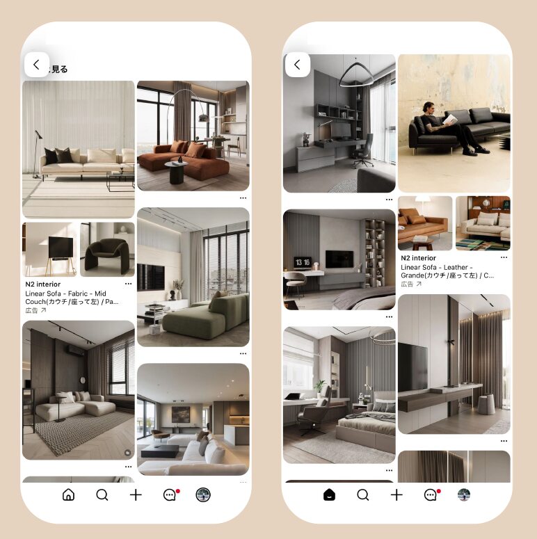 N2 interiorは、2024年10月からPinterest広告の活用を開始。ECプラットフォームShopifyの商品カタログのデータをAPI連携で直接Pinterestに流し込み、「カタログ広告」として配信。Pinterest上で商品写真に惹かれたユーザーは、タップすればそのまま購入サイトに流入できるというシームレスな体験設計を構築した。