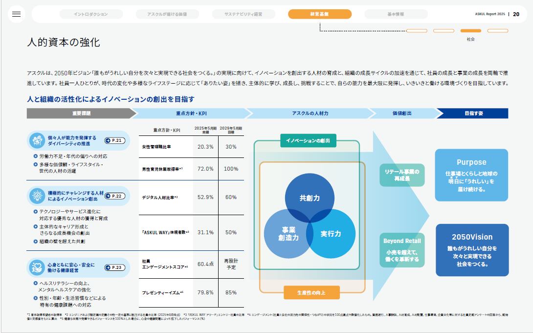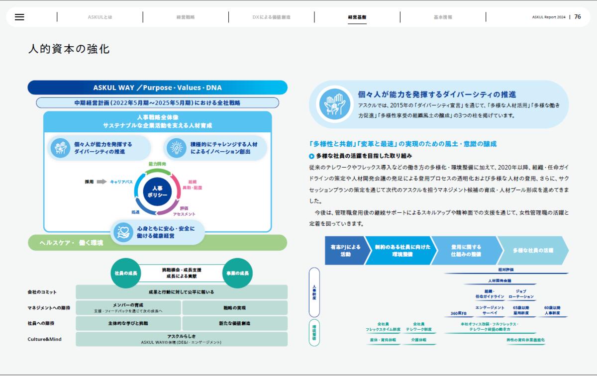 2024年版統合報告書では、同社のパーパス(存在価値)、バリューズ(価値観)、DNAから成り立つ「ASKUL WAY」と、中期経営計画(2022年5月期~2025年5月期)のもと、全社戦略人事戦略の全体像を示したうえで、以下の3分野での取り組みを記載していた。