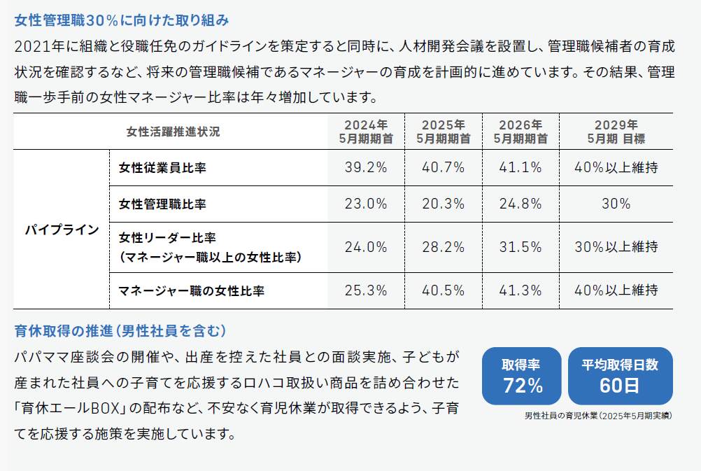 併せて、重点方針・KPIについても明示しており、女性管理職比率は2025年5月期期首の20.3%から2026年5月期期首には24.8%へ上昇。2029年5月期目標の30%に向けた進捗を示した。