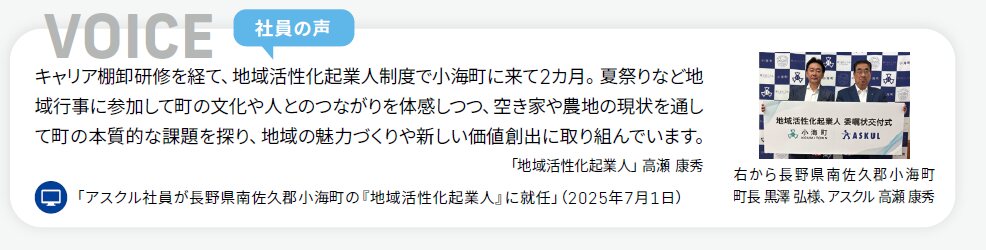 また、「シニア人材の活躍機会提供/年齢にとらわれないキャリア支援」の取り組みのひとつとして「キャリア棚卸研修+地域活性化起業人」を挙げるが、実際に地域活性化起業人として活躍する社員の声を掲載することで、より伝わりやすくなる工夫をしている。