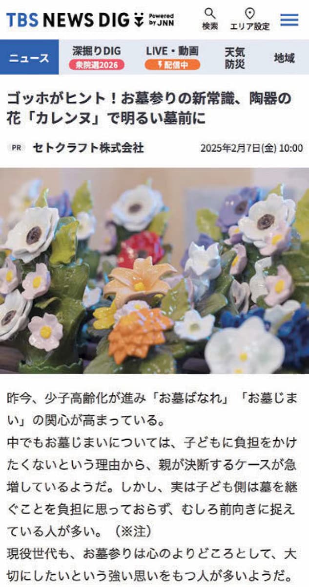 2025年2月7日公開の記事「ゴッホがヒント!お墓参りの新常識、陶器の花『カレンヌ』で明るい墓前に」。7月4日にはセトクラフトが作成している動画を記事内に埋め込み、2本目のタイアップ広告を公開、商品の魅力を深掘りした。