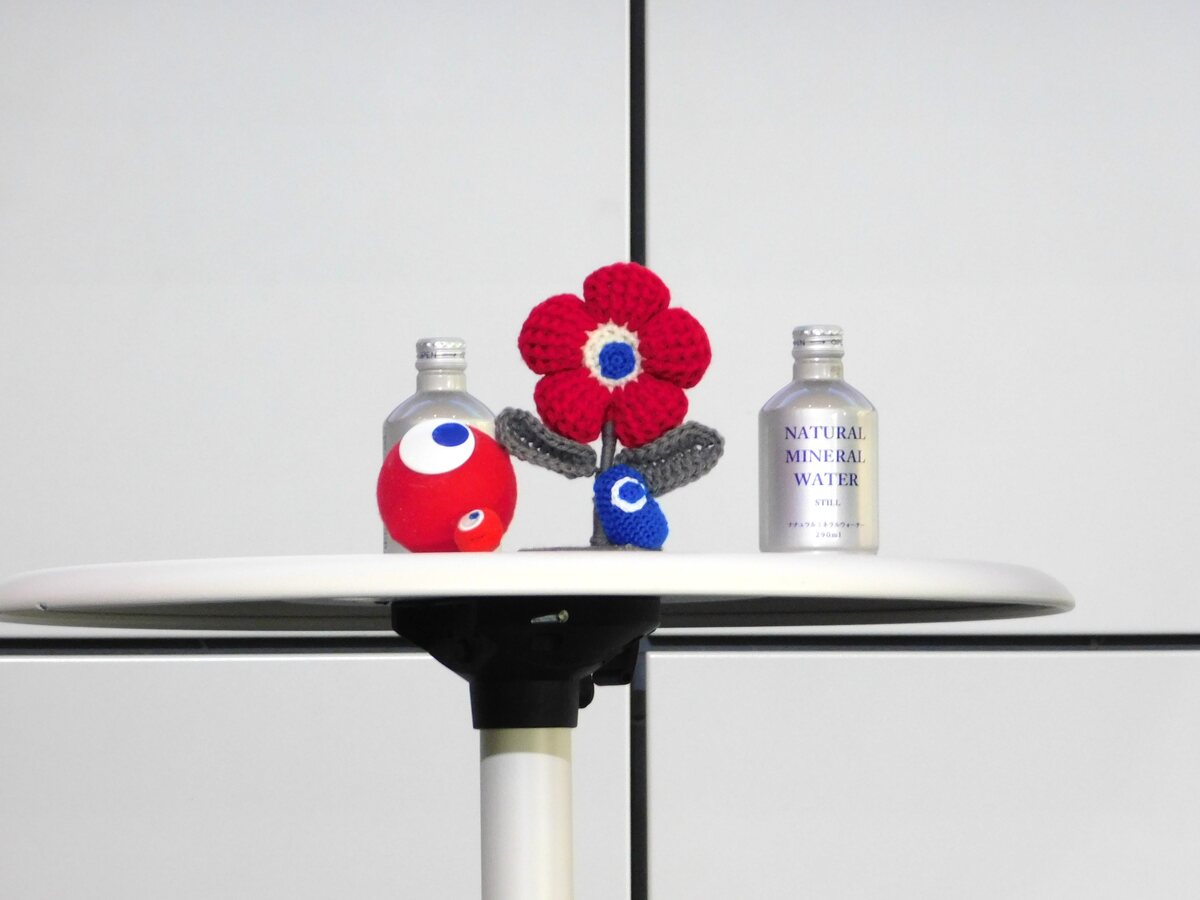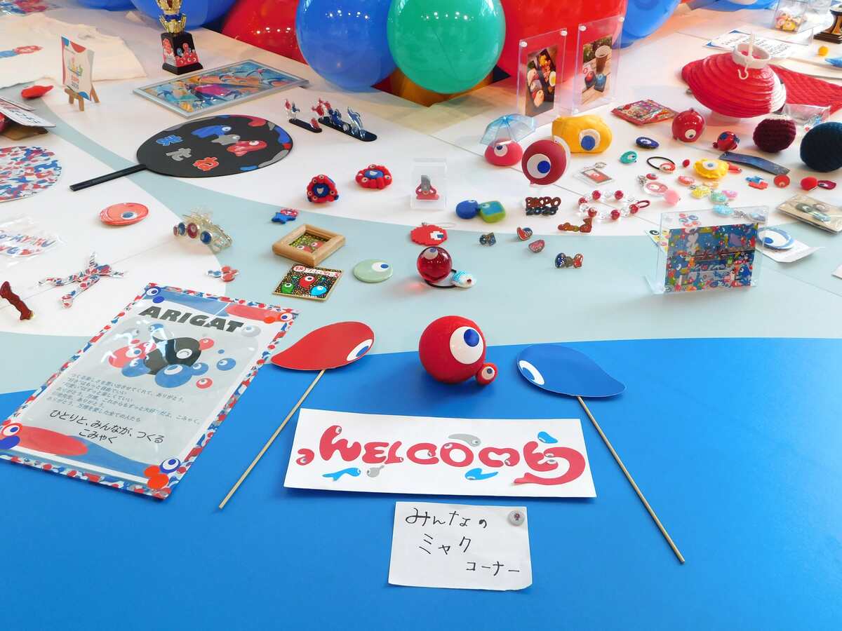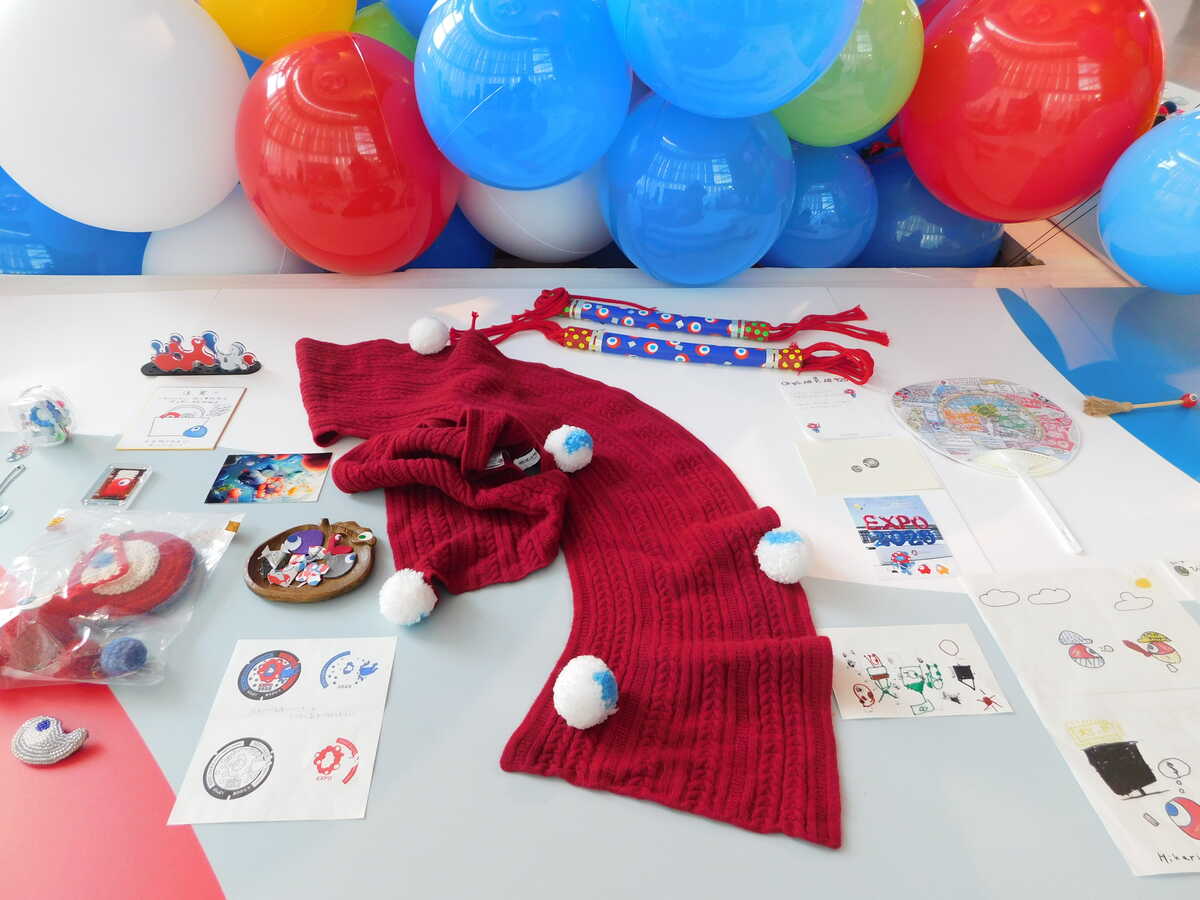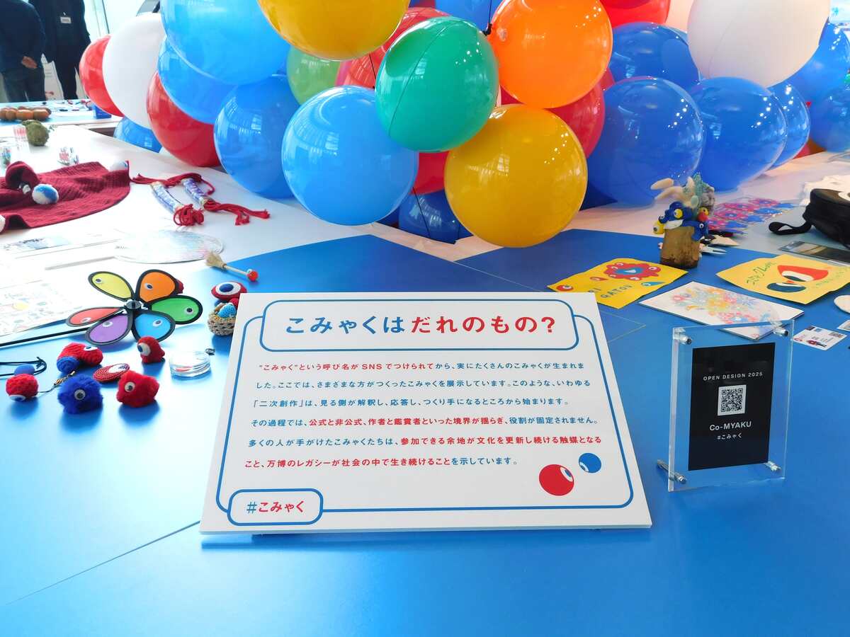 引地:かわいいですね。これはなんでしょう、なんて(笑)。ご存じの方もいらっしゃるかもしれませんが、昨年の万博の閉幕間際に京都と大阪でデザインシステムの展覧会を開催しました。そのうち大阪での開催時に、来場された皆さんがこのような手づくり「こみゃく」の二次創作作品をたくさん持ち込んでくれて。勝手に置いていってくれたんです。それがまるでミャクミャクへの奉納のようで、僕らは勝手に「奉納物」と呼んでいました。それを大切に保管しておきまして、今回の会場にもたくさん持ってきました。