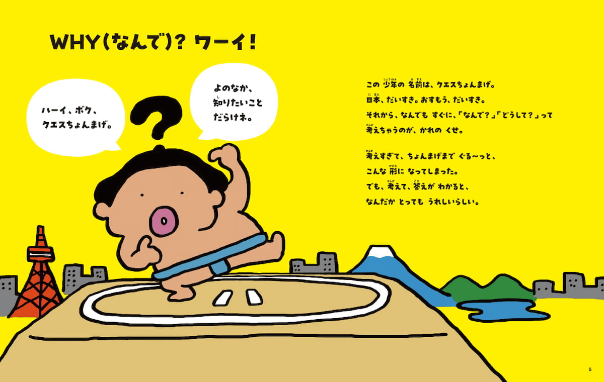 「国力がダウンして元気を失っているところがある日本ですが、本来は素晴らしい文化を持つオリジナリティあふれる島国。自分を含めた日本の人々に日本の魅力をもっと知って好きになってもらい、自分のルーツに自信を持てたらいいなという思い。そして正解のない今の時代、子供たちに質問力をつけてほしいという思いから、頭がクエスチョン型の髷のキャラクターを考えました。AD糸乗が二頭身にするアイデアを出し、国技であるお相撲さんがいいんじゃないかなどと、みんなで考えてできあがったキャラクターです」(本間氏)