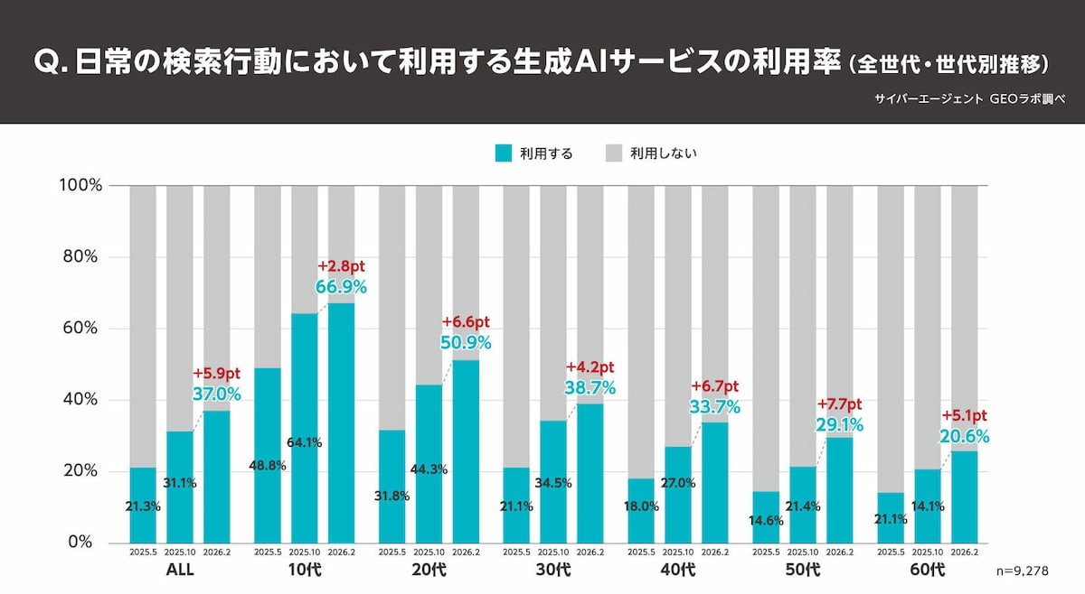 検索手段として生成AIを利用すると回答した割合は、2025年5月の21.3%から2026年2月には37.0%まで拡大し、約9カ月で15.7ポイント増加した。世代別では、特に50代(+7.7ポイント)、40代(+6.7ポイント)、20代(+6.6ポイント)の伸びが大きく、若年層だけでなく幅広い世代で利用が進んでいる。