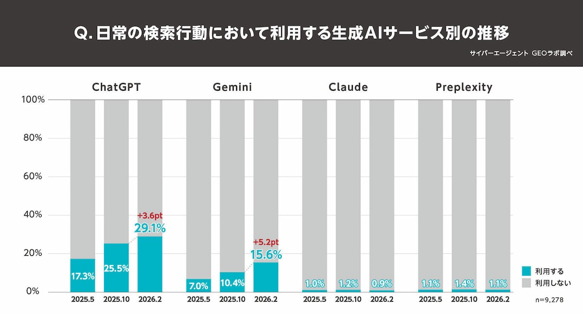 また、Google検索に組み込まれた「AIモード」の利用率は21.0%となり、Gemini単体の利用率(15.6%)を上回った。10代では33.5%が利用しており、検索サービスに統合されたAI機能が急速に浸透していることがわかった。