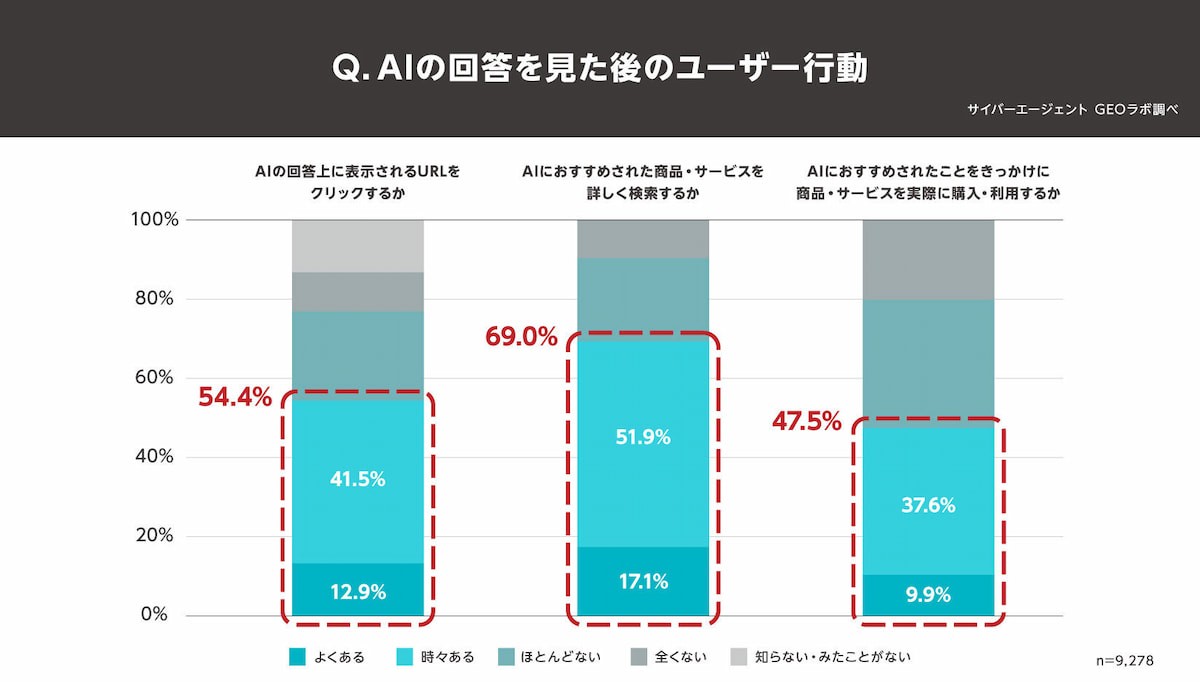 さらに、AIの回答が消費行動にも影響を与えている。AIの回答に表示されたURLをクリックした経験がある人は54.4%に達し、AIに勧められた商品やサービスをきっかけに実際に購入・利用した経験がある人は47.5%に上った。生成AIは情報収集のツールにとどまらず、購買行動に直結する存在になりつつあることが明らかになった。