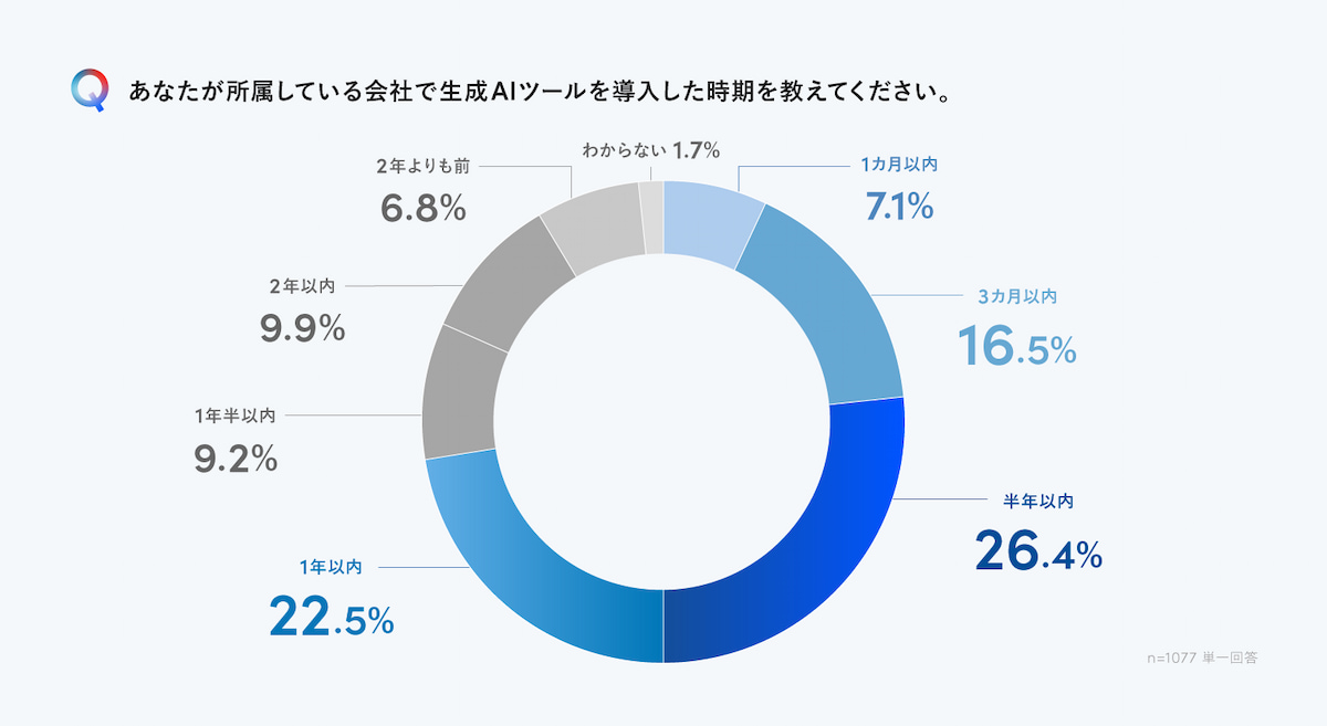 自社で生成AIツールを導入した時期について調査したところ、最多の回答となったのは、「半年以内」(26.4%)。次いで22.5%が「1年以内」、16.5%が「3カ月以内」、7.1%が「1カ月以内」と続き、回答者のうち72.5%が1年以内に導入していることが明らかになっている。