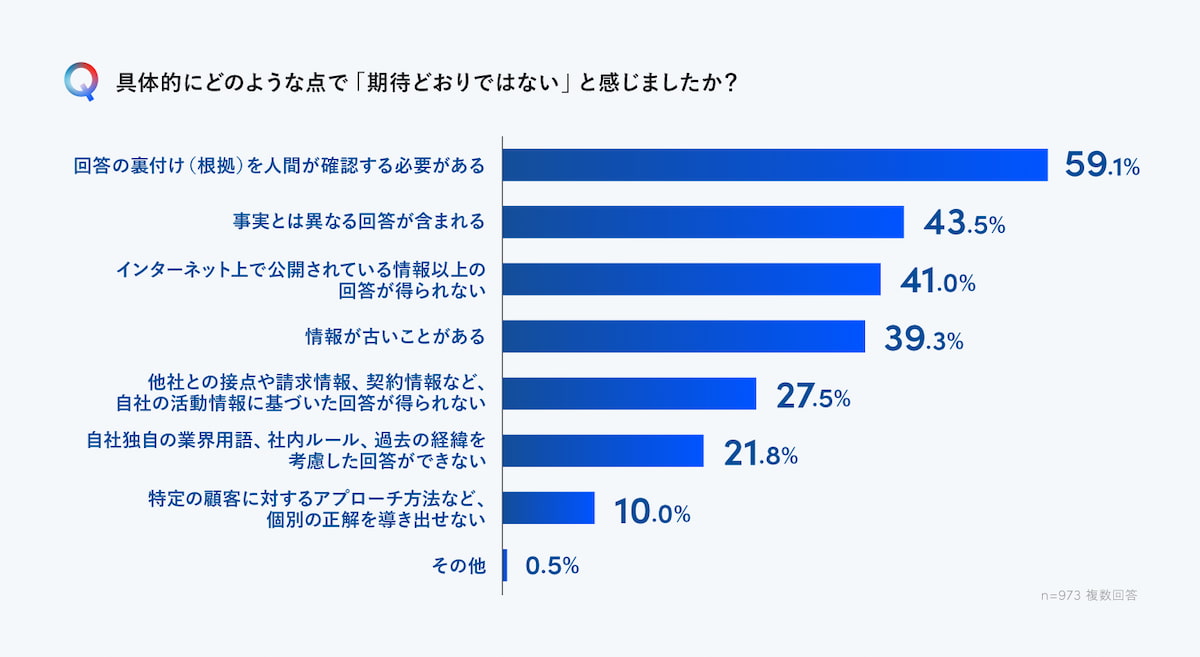 期待通りではないと感じた理由の上位には、「回答の裏付けを人間が確認する必要がある」(59.1%)、「事実とは異なる回答が含まれる」(43.5%)に次いで「インターネット上で公開されている情報以上の回答が得られない」(41.0%)が挙がっている。
