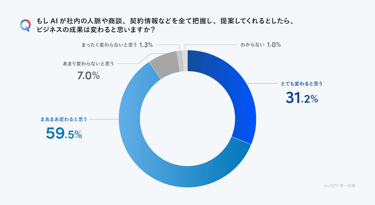 「AIが社内の人脈や商談情報を把握すれば、ビジネスの成果が変わると思うか」という質問に対しては、「とても変わると思う」「まあまあ変わると思う」と回答した割合は9割以上にのぼった。