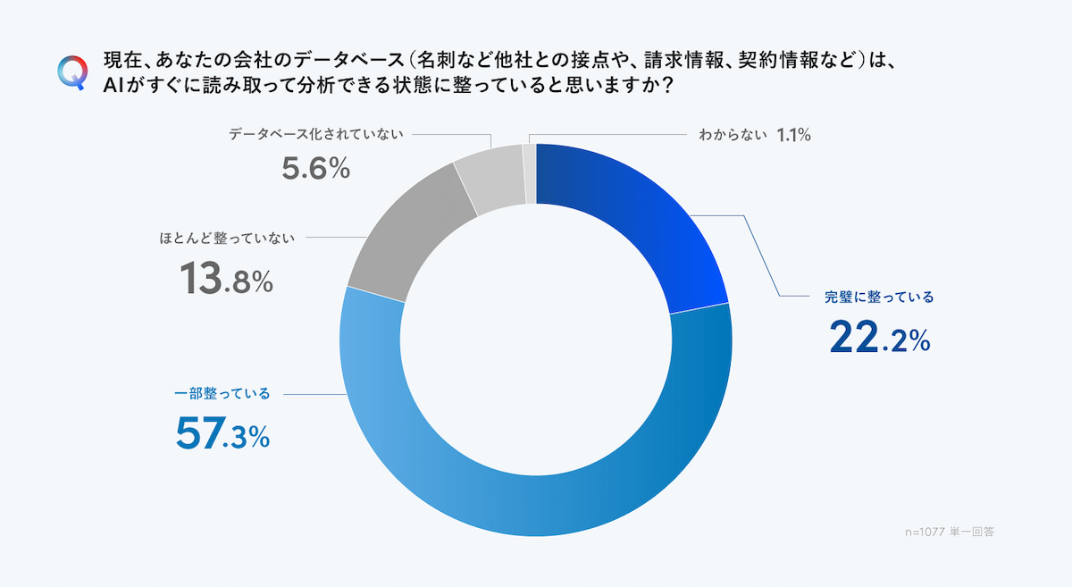 一方で、名刺管理や請求情報、契約情報といった社内のデータが「AIがすぐに読み取って分析できる状態まで整備されているか」について、「完璧に整っている」と回答した人は22.2%。57.3%の回答者が「一部整っている」と回答しており、半数以上の企業では整備が道半ばであることが明らかになった。