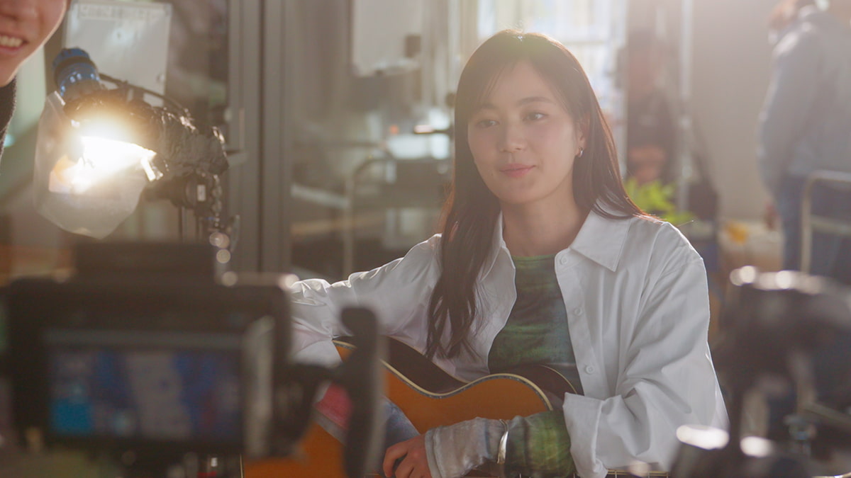 シーンは生田さんによるギター演奏から始まる。うつむく男子高校生や女性が「三ツ矢サイダー」を口にしたことをきっかけに、次第に表情を明るくしていく。青空をそのまま飲んでいるような主観映像や、炭酸を思わせるきらめく天気雨の演出、終盤の雲一つない空の下で生田さんがアコースティックギターを奏でるカットを通じて、商品を飲む爽やかさと気持ちよさを表現した。