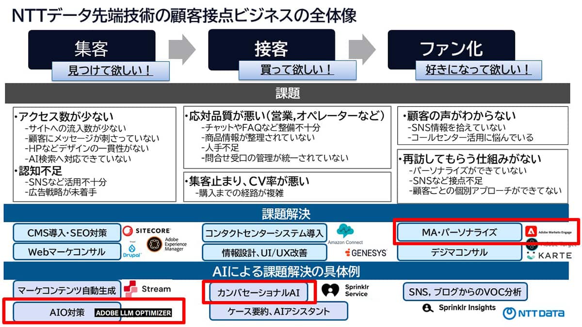 続いて安部氏は、マーケティングの実行プロセスを「集客」「接客」「ファン化」の三つに大別し、それぞれのフェーズで企業が抱える典型的な課題と、それに対するソリューションの全体像を解説した。