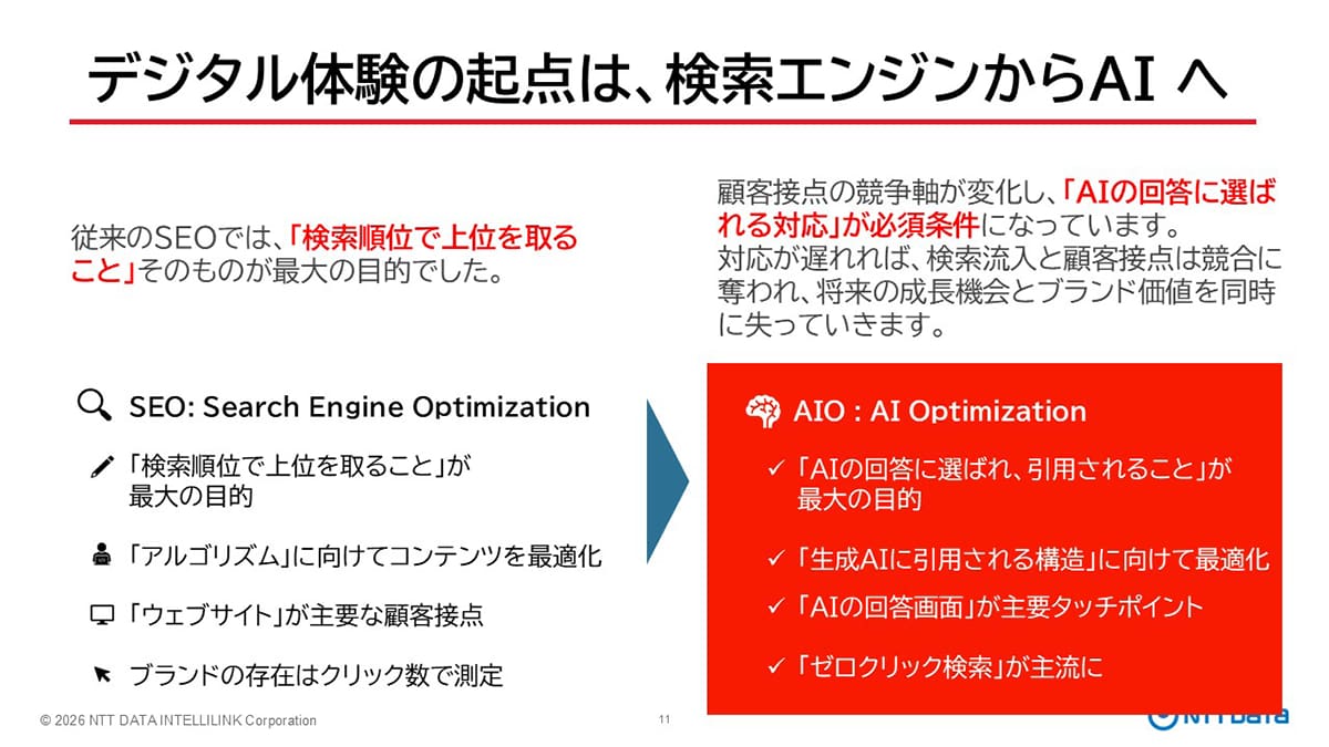 最初のテーマは「AIO(AI Optimization)」である。安部氏は、検索の起点が従来の検索エンジンからAIへとシフトしている現状を指摘した。Googleなどの検索結果の上部にAI生成の回答が表示されるようになり、ユーザーはその回答で満足してしまい、下の検索結果一覧までスクロールしない傾向が強まっているという。「今後はAIの回答に選ばれる対応が必須の条件になります」と強調。この対応が遅れれば、検索流入の機会や顧客接点を競合に奪われるリスクがあると警鐘を鳴らした。