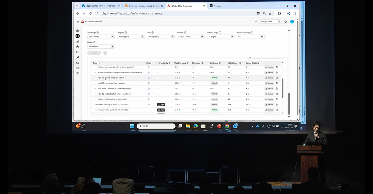 デモでは、Google Chromeの拡張機能「AI Content Visibility Checker」を使い、自社サイトがAIに読み込まれている割合を簡易的に分析。続いて、「Adobe LLM Optimizer」のダッシュボード画面を用いて、架空のコーヒーショップのサイトを分析する様子を示した。AIの回答の中に自社ブランドが言及・引用された回数や、競合との比較、さらにはユーザーが実際に入力したプロンプト(指示内容)に対して自社コンテンツがどの程度貢献したかといった点まで可視化できることを紹介した。