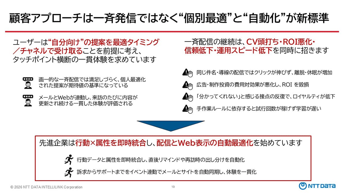 最後に安部氏は、NTTデータ先端技術の強みとして「マーケティングテクノロジーとカスタマーサポートシステムのトータル提供」「AI機能などの先進技術力」「グローバルプロジェクト対応力」の三つを挙げた上で、「皆様のマーケティングの未来を、一緒に創らせていただきたい」と締めくくった。