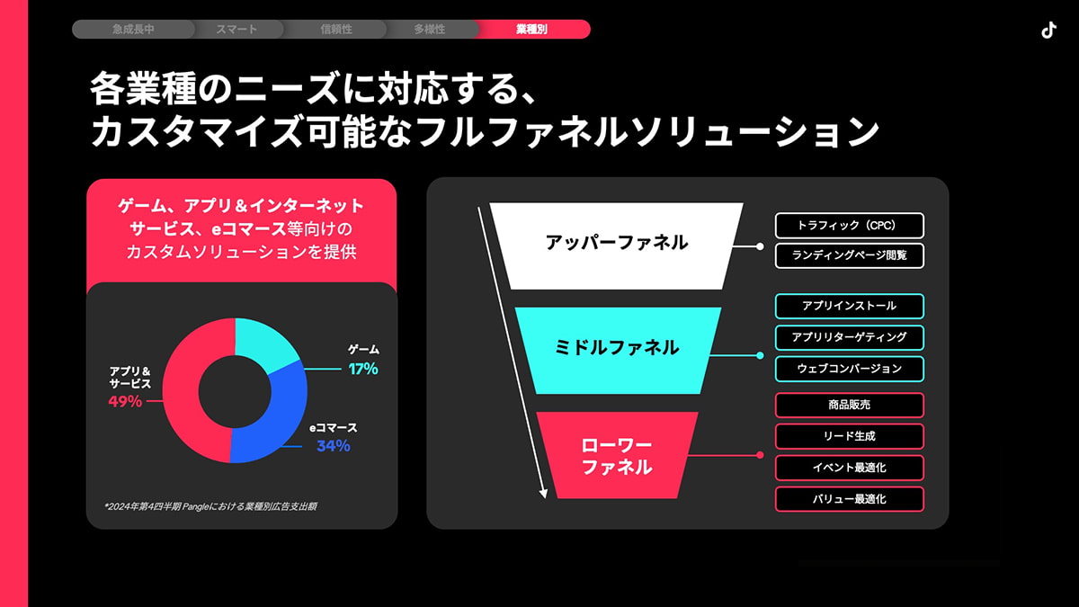 「TikTok広告マネージャーから一元管理できる利便性に加え、独自の機械学習による高精度なターゲティングが強みです。没入感の高い縦型全画面動画など多彩なフォーマットを持ち、TikTokだけではリーチしきれない層も含め、圧倒的な在庫規模でアプローチできるのがPangleの最大の特長です」
