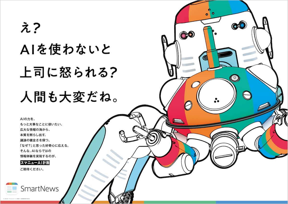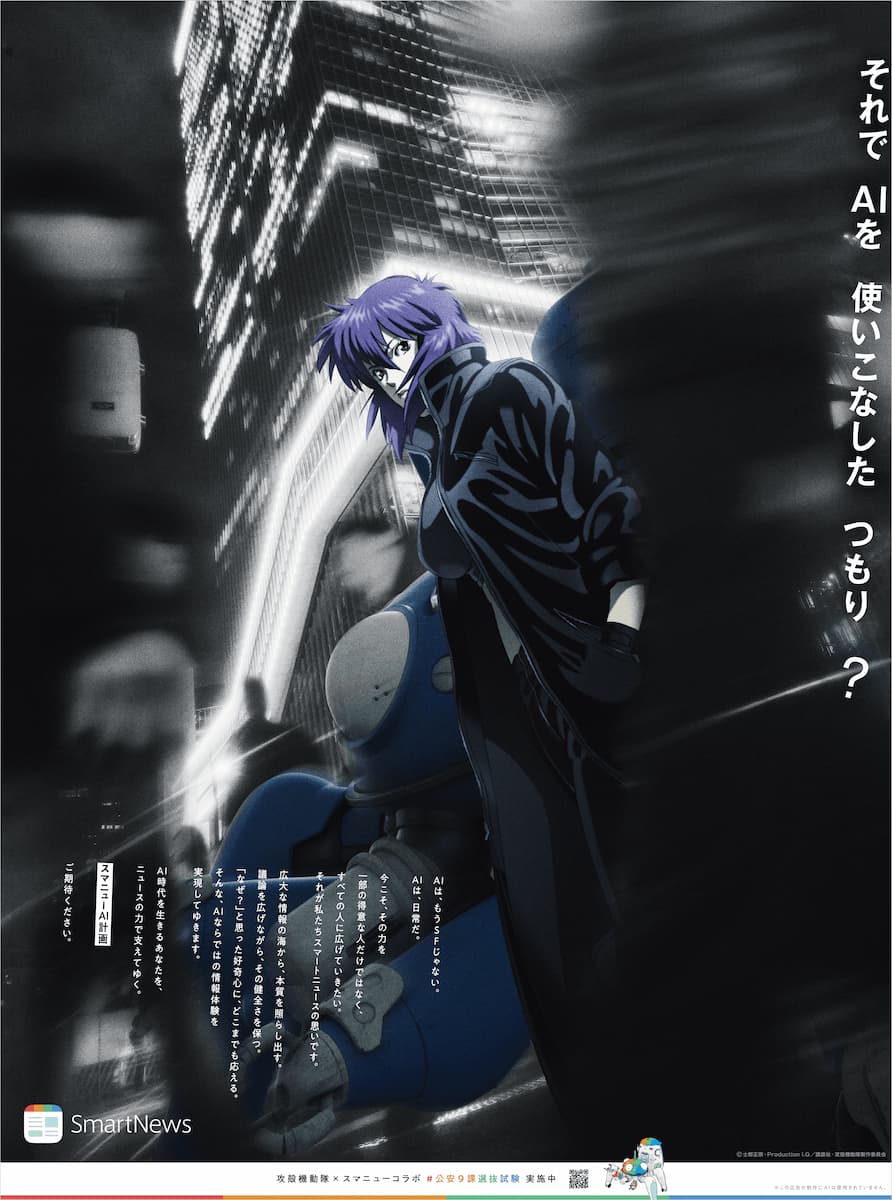 スマートニュースは3月24日、SF作品『攻殻機動隊 S.A.C.』とコラボレーションした「スマニューAI計画」キャンペーンを開始した。本キャンペーンは、スマートニュースがアプリ「SmartNews」内で今後予定している、AIを活用した情報体験のアップデートに先駆けて実施するもので、新聞広告、Webサイト、OOHの3つのチャネルでメッセージを発信していく。