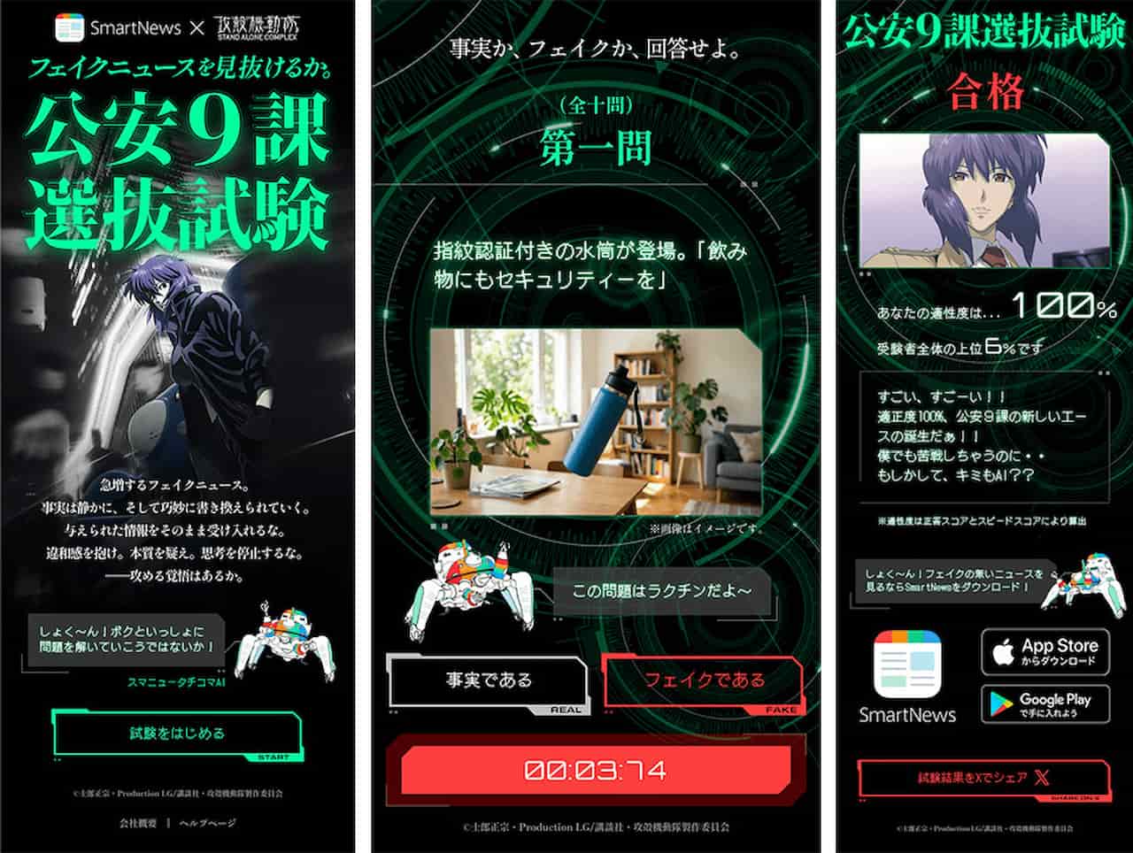 さらに特設Webサイトではクイズ企画を実施。「#公安9課選抜試験」と題した架空の試験を模した参加型の診断コンテンツに挑戦できる。複数のニュースから、創作が含まれるフェイクニュースを見抜き、正解率に応じて、『攻殻機動隊 S.A.C.』の異なるキャラクターの評価を受けられる仕様だ。