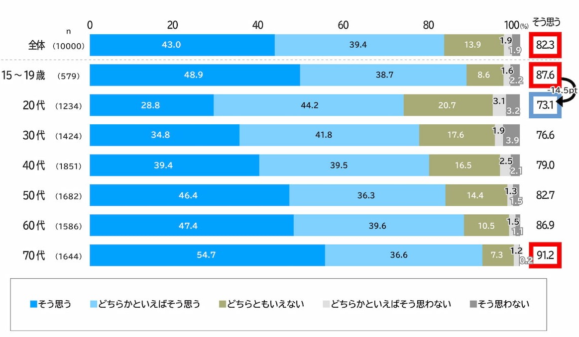 今後5年間で気候変動の影響が強まるかどうかを尋ねる調査では「そう思う」「どちらかといえばそう思う」と回答した人は全体の82.3%を占めた。世代別では、70代(91.2%)、15~19歳(87.6%)での比率が高く、20代(73.1%)が最も低くなった。