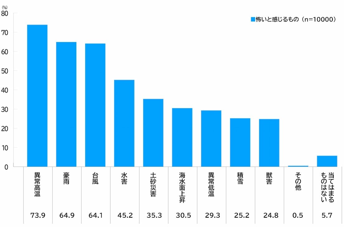 「気候変動の影響で生じる災害のうち、怖いと感じるもの」に関する調査では、「異常高温」(73.9%)、「豪雨」(64.9%)、「台風」(64.1%)が上位となった。