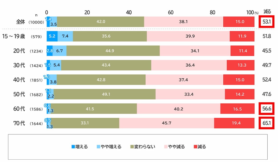 気候変動が外出にもたらす影響を調査する質問では「外出が減る」と回答する人は53.1%と過半数を超えた。特に70代では65.1%が「減る」と回答し、全体よりも12.0ポイント高い結果となった。