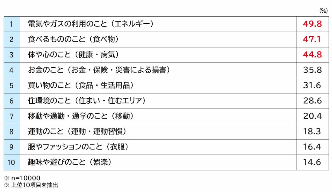 「食べるもののこと(食べ物)」(47.1%)、「体や心のこと(健康・病気)」(44.8%)がこれに続いた。特に「食べ物」「家事」など、生命維持や生活基盤に近いカテゴリについては50代以上の回答が多くなっている。対して10~40代では、「仕事や勉強」「娯楽」など、余暇や自己実現に関わるカテゴリでの回答が目立った。