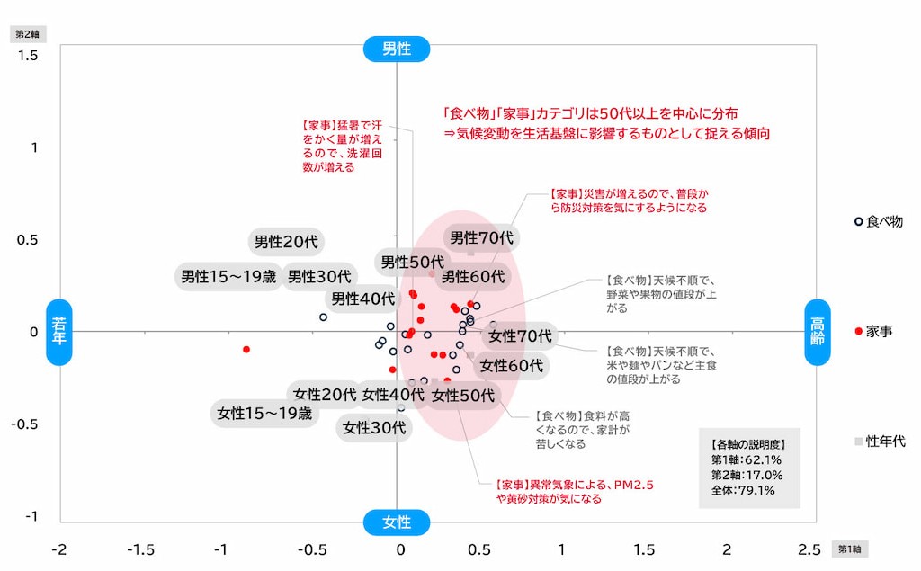 今後5年間で、気候変動の影響で変化が生じそうな生活カテゴリについての調査では、「電気やガスの利用のこと(エネルギー)」(49.8%)が最も回答数が多かった。具体的には、「夏が暑くなるので、冷房をたくさん使う」「電気代が上がるので、生活費が増える」といった回答が多数を占めた。