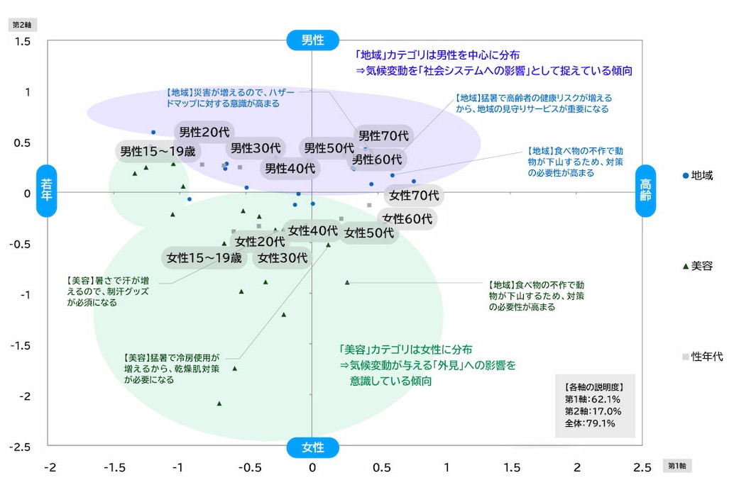 性別ごとにみると、「美容」など外見に関わるカテゴリは女性が、「地域」など社会システムに関わるカテゴリは男性が多いという傾向がみられる。