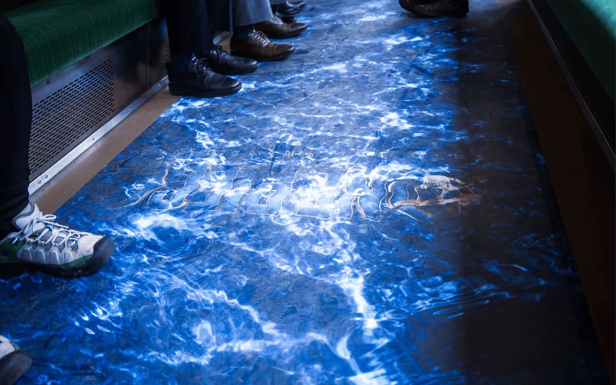 江ノ電車内の様子。広告ジャックを展開しているほか、足元はまるで海が透けて見えているかのようなデザインに。