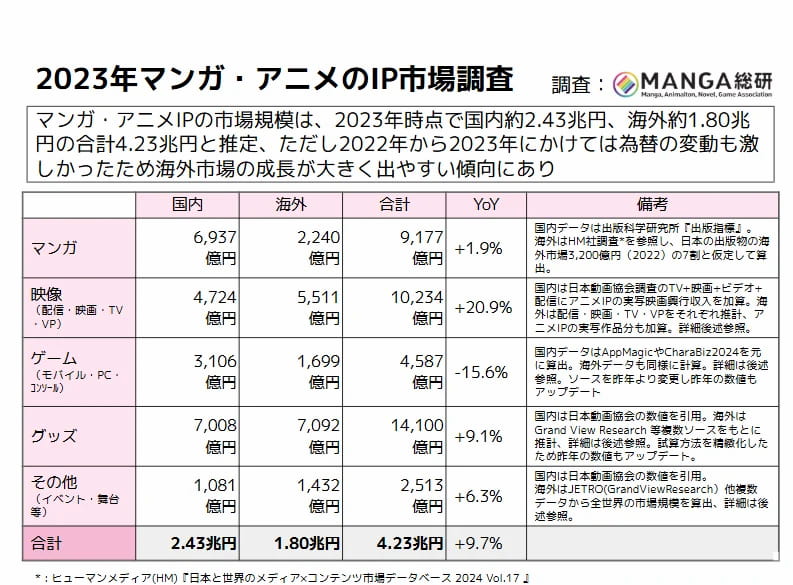 風が吹けば、桶屋が儲かる。いま、日本のマンガIP市場に吹いている風は、かなり強い。私が代表をしているMANGA総合研究所が発表した「第2回マンガIP市場調査報告書2025」では、2023年時点で日本のマンガIPのグローバル市場規模は約4兆円。前年比9.7%成長という堅調な伸びを見せています。海外市場はすでに全体の44%(約1.8兆円)。特に配信・映画を中心とした海外映像市場は前年比20%増と高成長を記録しました。