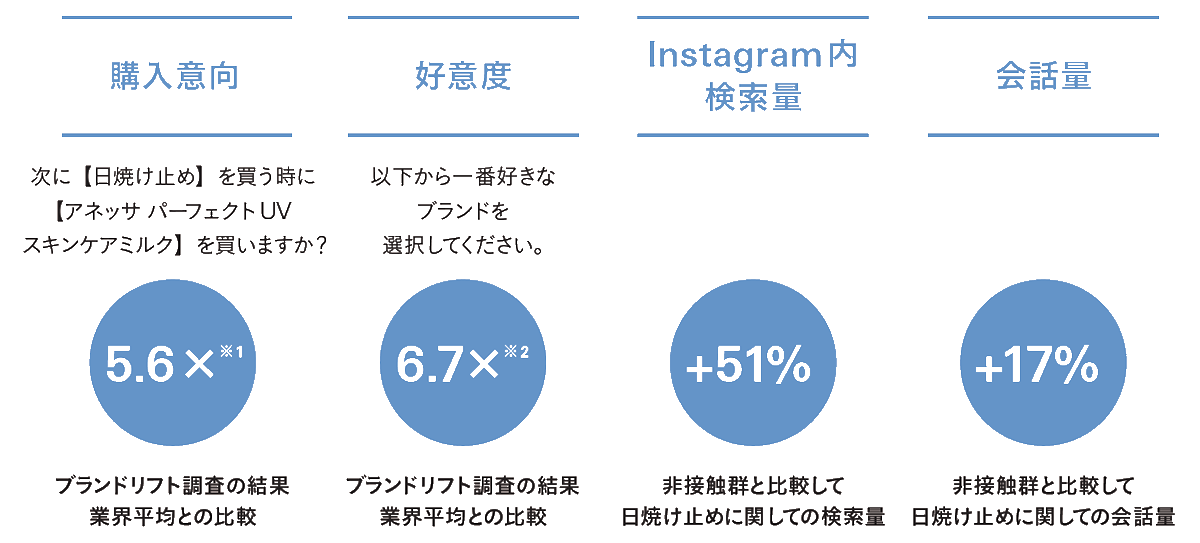 例えば、資生堂さまとの取り組みでは、利用者がどのようなトーンで美容を語り、どんなハッシュタグに反応しているかを徹底的に分析しました。結果として、購入意向は業界平均の5.6倍、ブランド検索量は51%増という高いパフォーマンスを示しました【図表2】