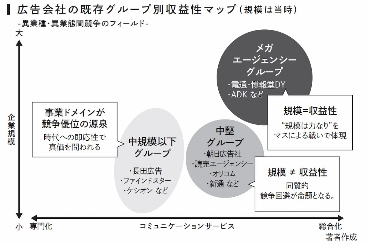 当時、私は業界地図の不透明さに苛立ち、ある週末にオフィスに籠りました。壁一面に模造紙を貼り付け、国内の広告会社3000社のうちで上位100社と顕著な成果を上げている企業をピックアップして、サービス領域と収益性という2軸でマッピングしました。それは、混沌の中から一本の道筋を見つけ出すような作業でした。そして、数多の点を打ち込んでいくうちに、そこに恐ろしいほど明確な「領域」になる断層が浮かび上がってきたのです。