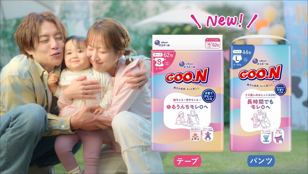 今回、新たにブランドの顔として選ばれたのは、結婚19年目を迎え、現在第5子の育児に奔走する杉浦・辻夫妻だ。18年間にわたり育児を続けてきた二人のリアルな空気感を通じ、おむつ漏れなどの「育児あるある」を解消し、家族に心のゆとりが生まれる様子を表現している。