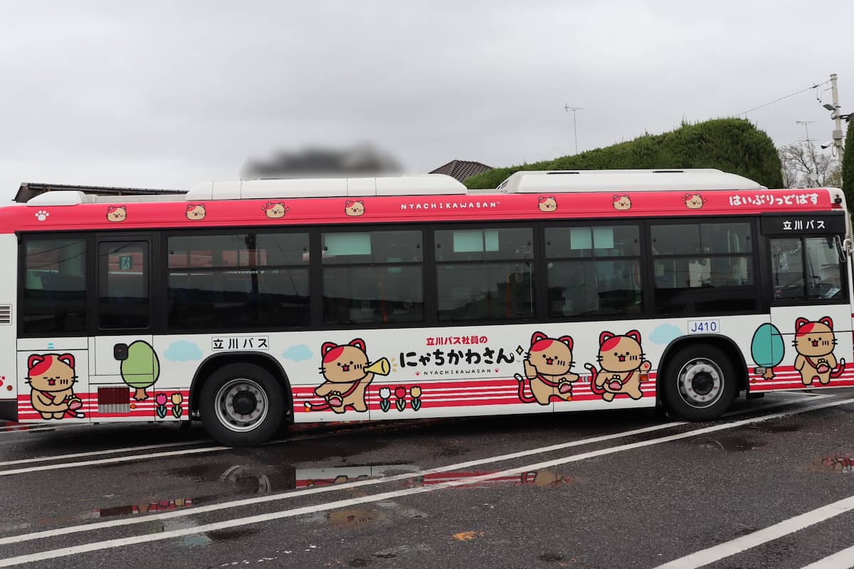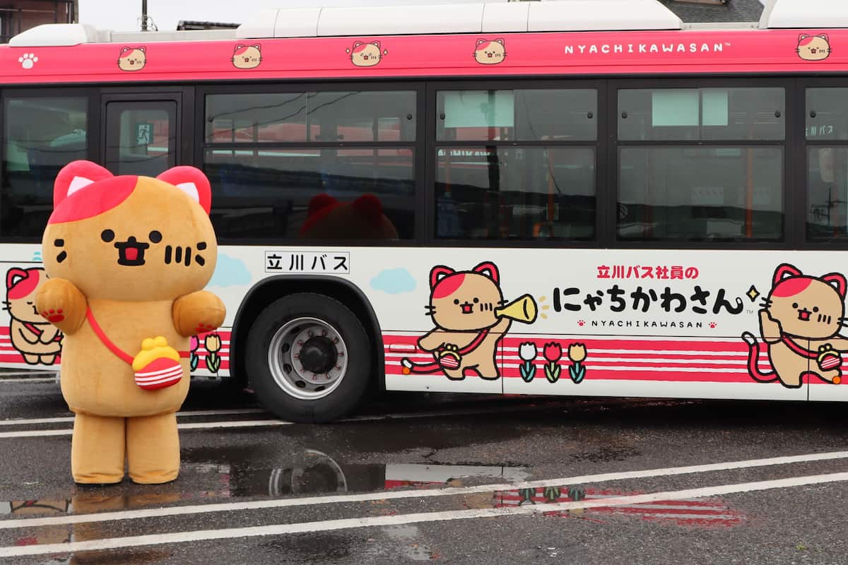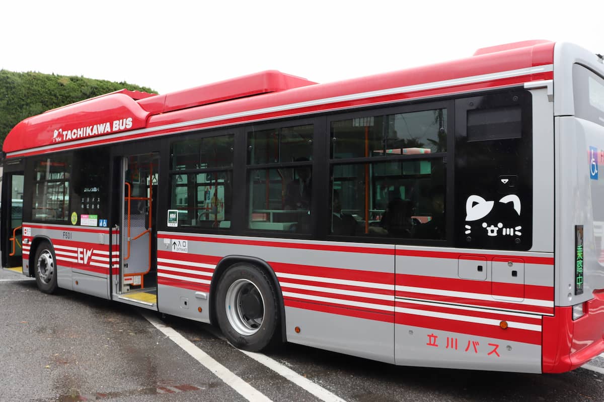 4月1日からは、EV路線バスのデザインを「にゃちかわさん」と立川バスの伝統カラーである赤・白を基調としたデザインに一新。今後導入される車両については、座席シートも「にゃちかわさん」仕様へと変更される。さらに車体全面にキャラクターを施した「にゃちかわさんラッピングバス」も運行する。