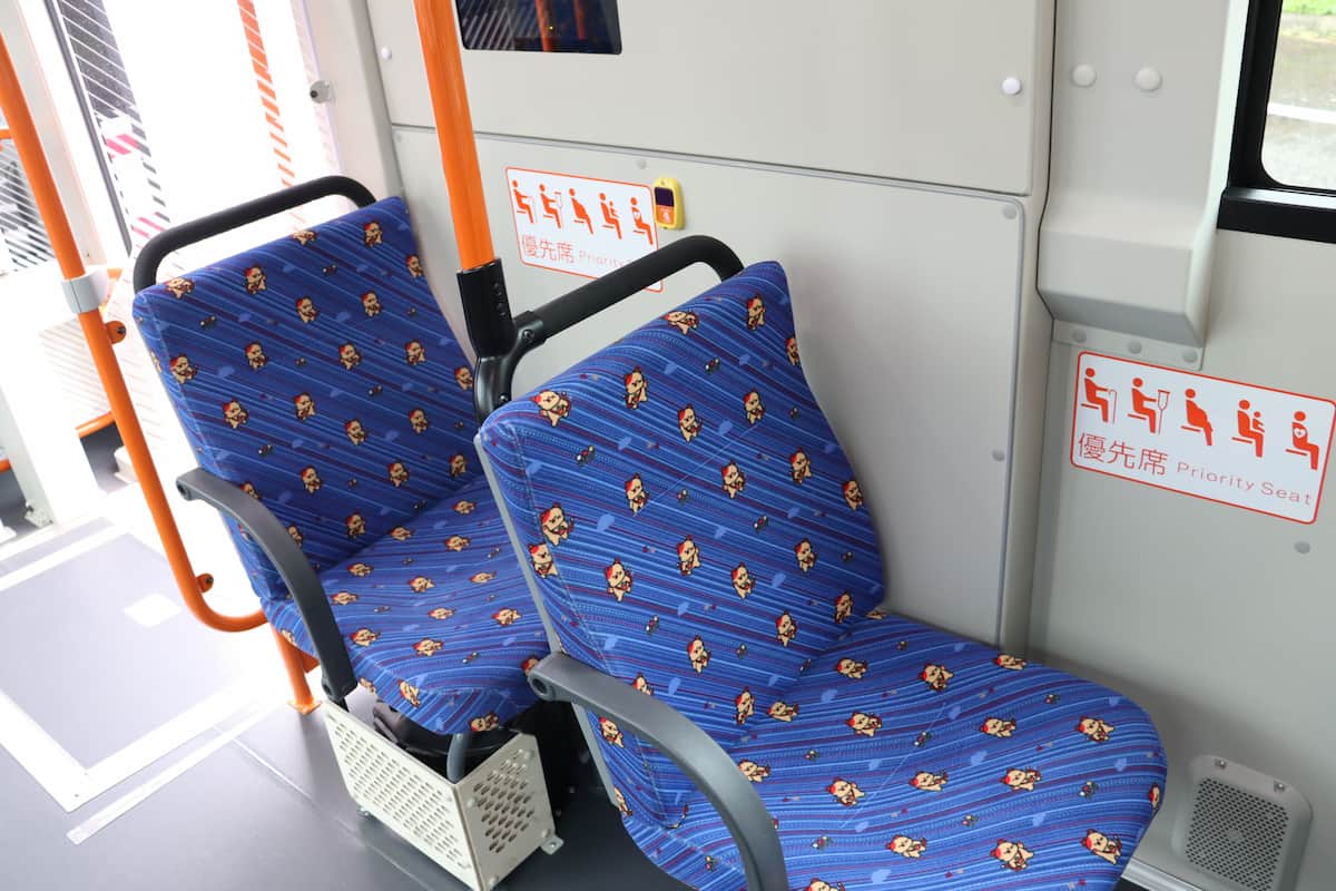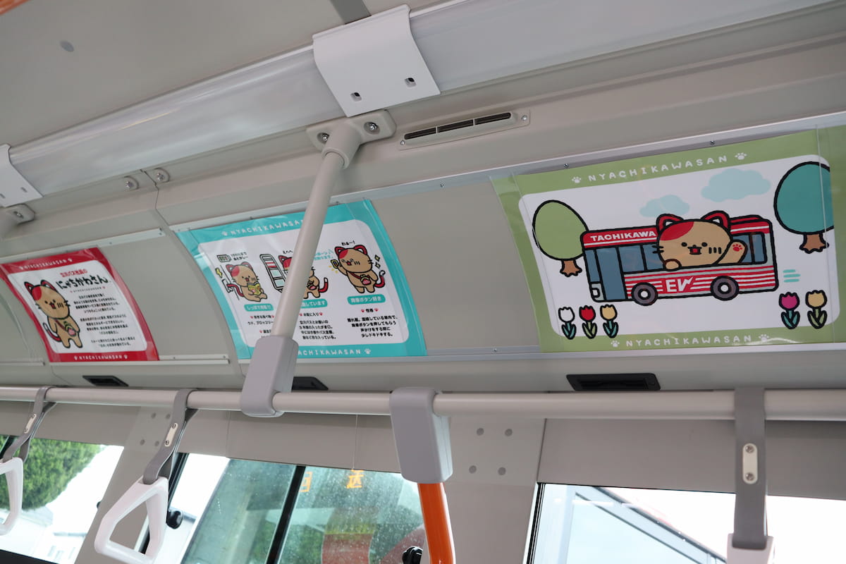 にゃちかわさんラッピングバス。「ハイブリッドバス」の表記も、キャラクターの世界観に合わせひらがなの柔らかなフォントが採用された。車内外の随所ににゃちかわさんの姿が。