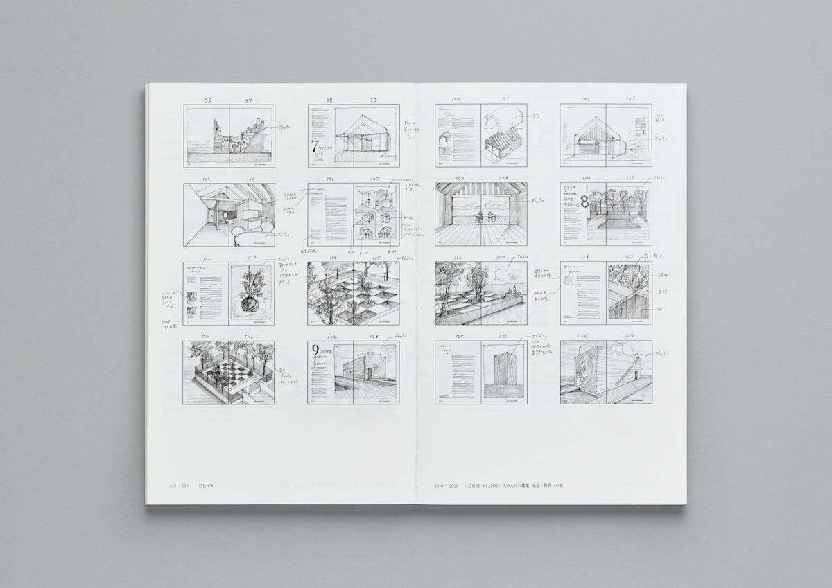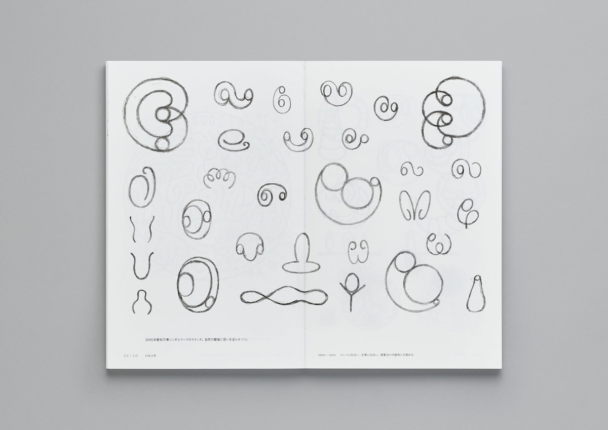 本展では、そんな原氏が2024年に上梓した初のスケッチ集『DRAW』から、心に浮かんだ造形を外に取り出すようにして描かれたドローイング作品や、展示の構想や設計をしながら編み上げられた書籍のラフスケッチなど、多岐にわたる原画を一挙に公開する。