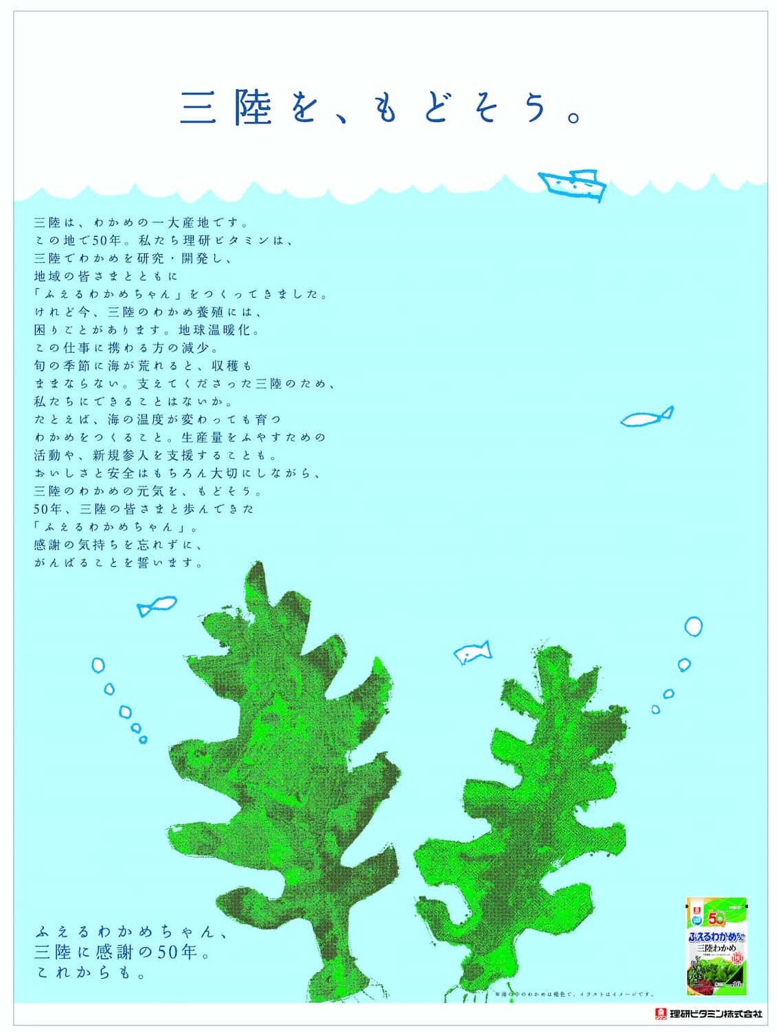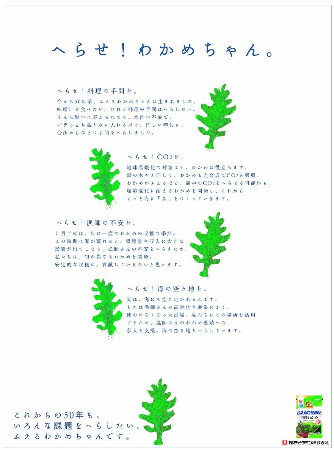 「へらせ!わかめちゃん。」は、商品の持ついろいろな特長を、現在の環境問題、漁師を取り巻く課題なども含めてメッセージしている。
