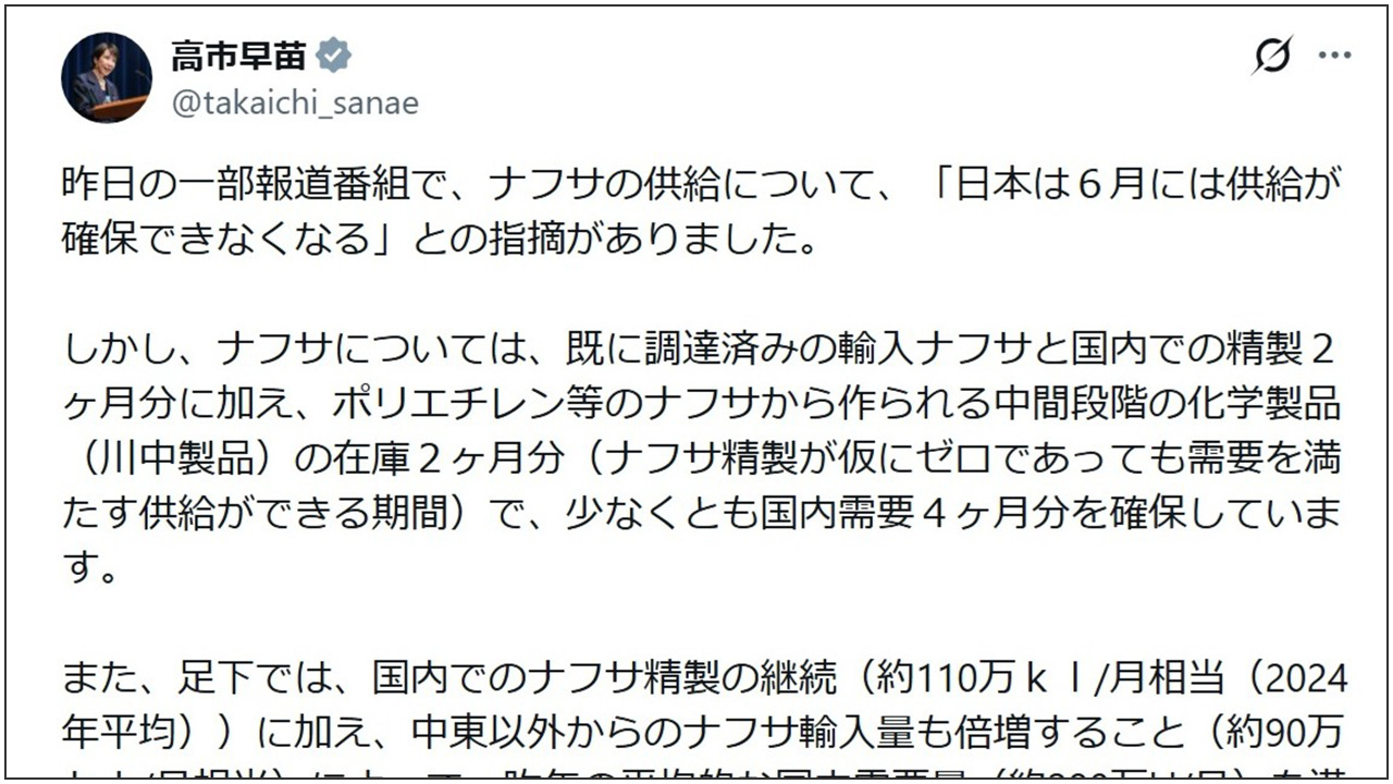高市首相がXで反論したのは、ナフサの供給について「日本は6月には供給が確保できなくなる」とした報道番組の指摘である。これに対し高市首相は、すでに調達済みの輸入ナフサと国内での精製2カ月分に加え、ポリエチレンなどナフサから作られる中間段階の化学製品、いわゆる川中製品の在庫2カ月分があり、少なくとも国内需要4カ月分を確保していると説明した。