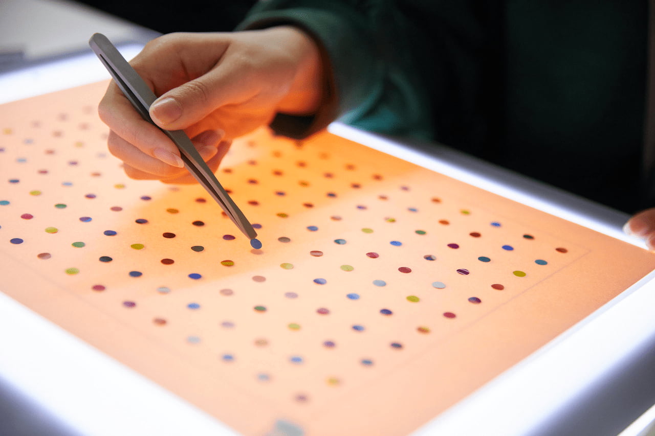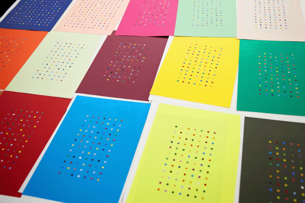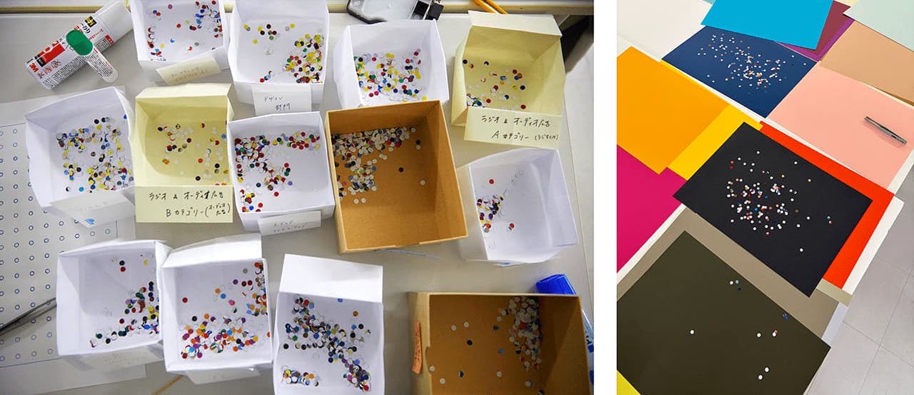 「くり抜かれた円を貼ることで生じる影やズレ。わずか6mmの円の中に見られる網点。それらを貼る色紙のテクスチャ。丸が並んでいるだけのシンプルなデザインなので、そういった細かな質感にこだわりたいなと思いました。