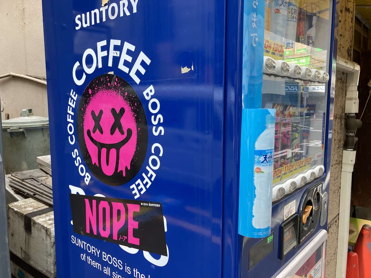 青色を基調に「BOSS」の顔が描かれたおなじみの自販機が、NOPEのロゴとパッケージデザインで “上書き” されたように見える。落書きしたような表現は、まるでBOSSにいたずらをしたかのようにも映る。一見するとBOSSへの侮辱とも受け取られかねない大胆な演出だけに、物議も呼んだ。