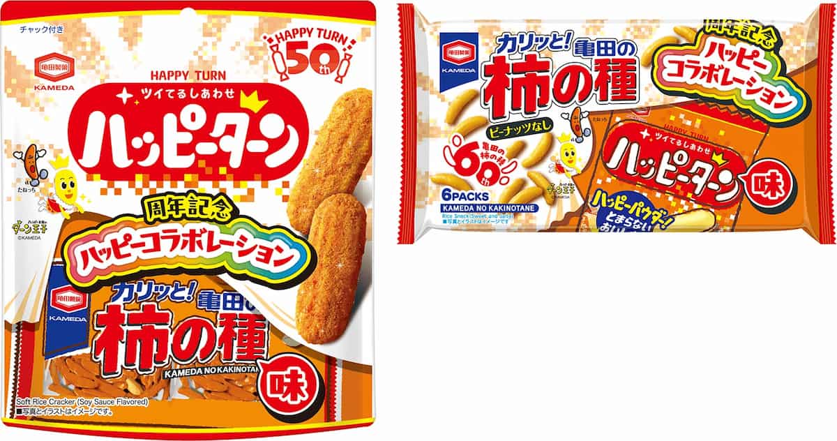 亀田製菓は、「亀田の柿の種 ハッピーターン味」と「ハッピーターン 亀田の柿の種味」を4月20日から発売する。「亀田の柿の種」の発売60周年と「ハッピーターン」の発売50周年を記念した期間限定商品で、同社の2大ブランドが互いの味わいを“入れかえる”コラボレーションに挑んだ。
